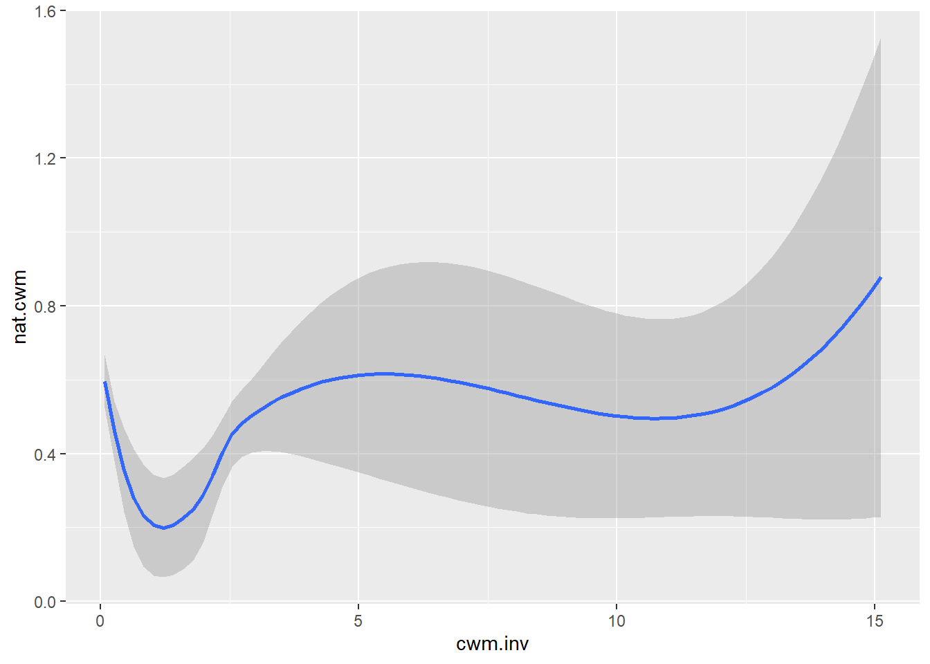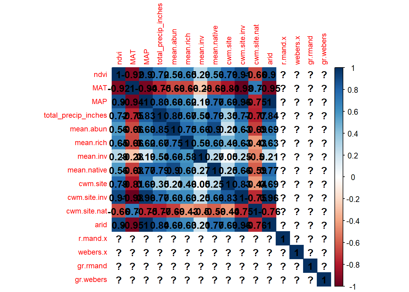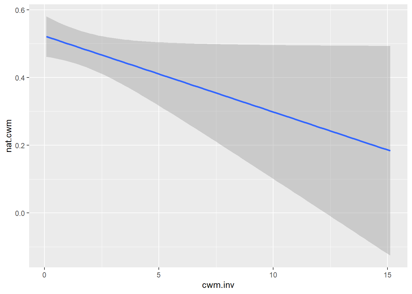 #join all the site levels to the other plant site levelcwm.site <- func.site$CWMcwm.site <-rename(cwm.site, cwm.site = seed.weight)cwm.site.inv <- func.site.inv$CWMcwm.site.inv <-rename(cwm.site.inv, cwm.site.inv = seed.weight)cwm.site.nat <- func.site.nat$CWMcwm.site.nat <-rename(cwm.site.nat, cwm.site.nat = seed.weight)mn.plt <-cbind(mn.plt, cwm.site, cwm.site.inv, cwm.site.nat)