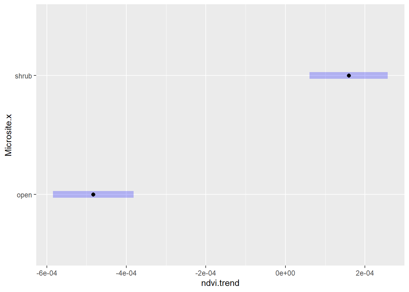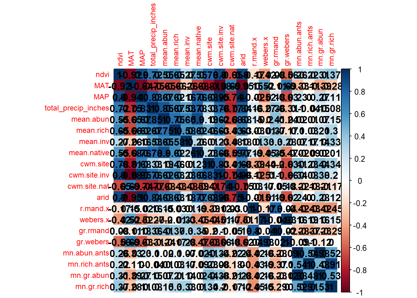 plt_wide$uniID <-paste(plt_wide$Site, plt_wide$Year.NA, plt_wide$Microsite, plt_wide$Rep.NA)plt_wide$uniID <-gsub(" ", "", plt_wide$uniID)plt_wide[is.na(plt_wide)] <-0env <- dplyr::select(plt_wide, 1:5, uniID)comm <- dplyr::select(plt_wide, 6:90)richness <-specnumber(comm)abun <-rowSums(comm)env$rich <- richnessenv$abun <- abun#import plant metadata for zero rowsreps <-read.csv("Raw Data/reps.csv")reps <-filter(reps, season =="spring")reps$uniID <-paste(reps$Site, reps$year, reps$Microsite, reps$Rep)reps$uniID <-gsub(" ", "", reps$uniID)plt.ag <-left_join(reps, env, by ="uniID")plt.ag$rich[is.na(plt.ag$rich)] <-0plt.ag$abun[is.na(plt.ag$abun)] <-0plt.ag <-rename(plt.ag, Site = Site.x, Year = year)plt.ag$Year <-as.factor(plt.ag$Year)ndvi$Year <-as.factor(ndvi$Year)plt.ag <-left_join(plt.ag, ndvi, by =c("Site", "Year"))
