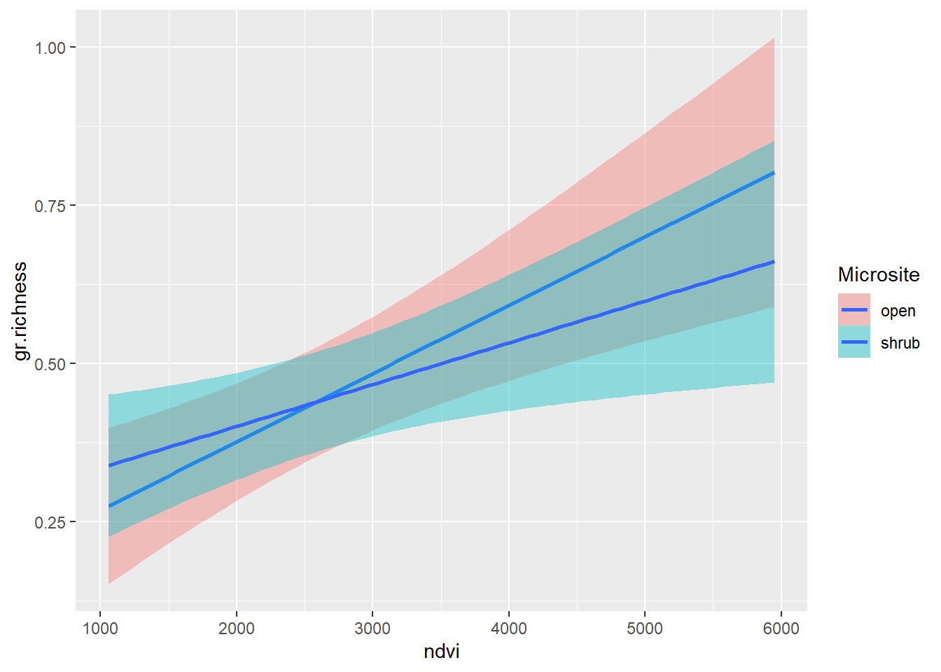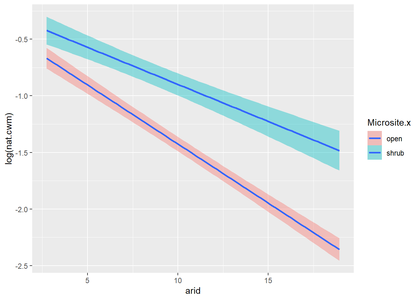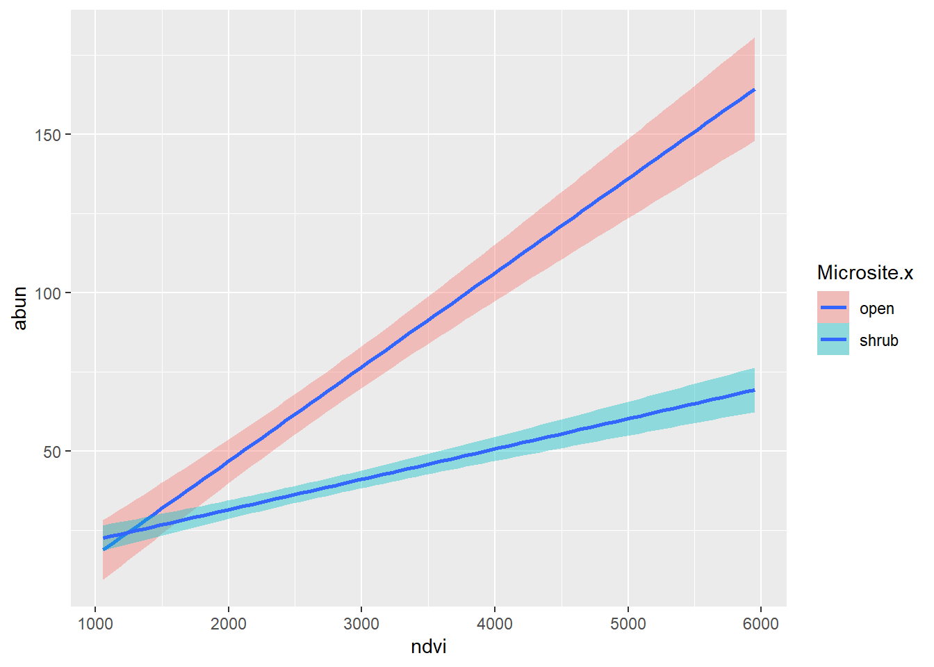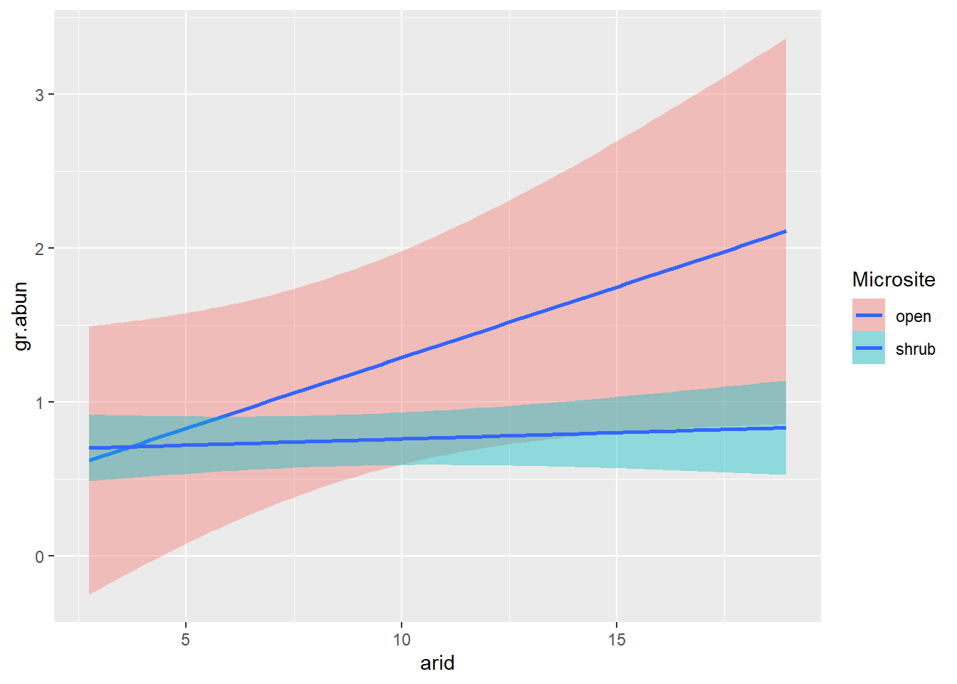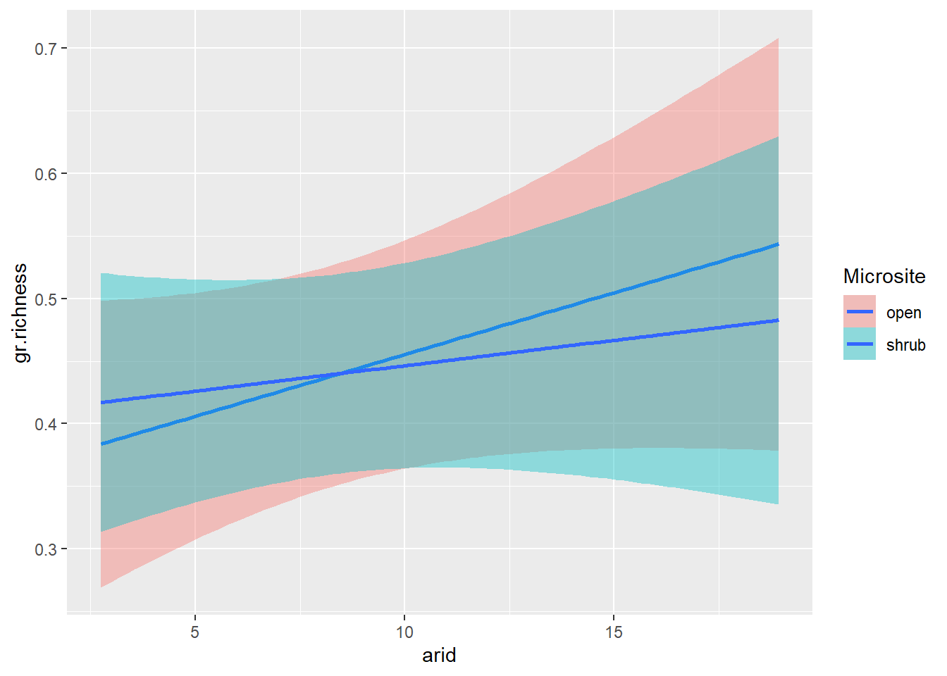 #adding a random effect for year doesn't improvem1 <-glmmTMB(rich ~ arid + Microsite.x + (1|Site) + (1|Year), family =poisson(), plt.ag)#adding ndvi does not improvem2 <-glmmTMB(rich ~ arid * Microsite.x + ndvi + (1|Site), family =poisson(), plt.ag)