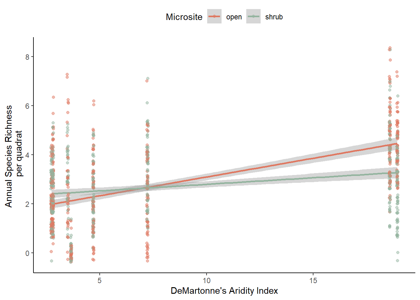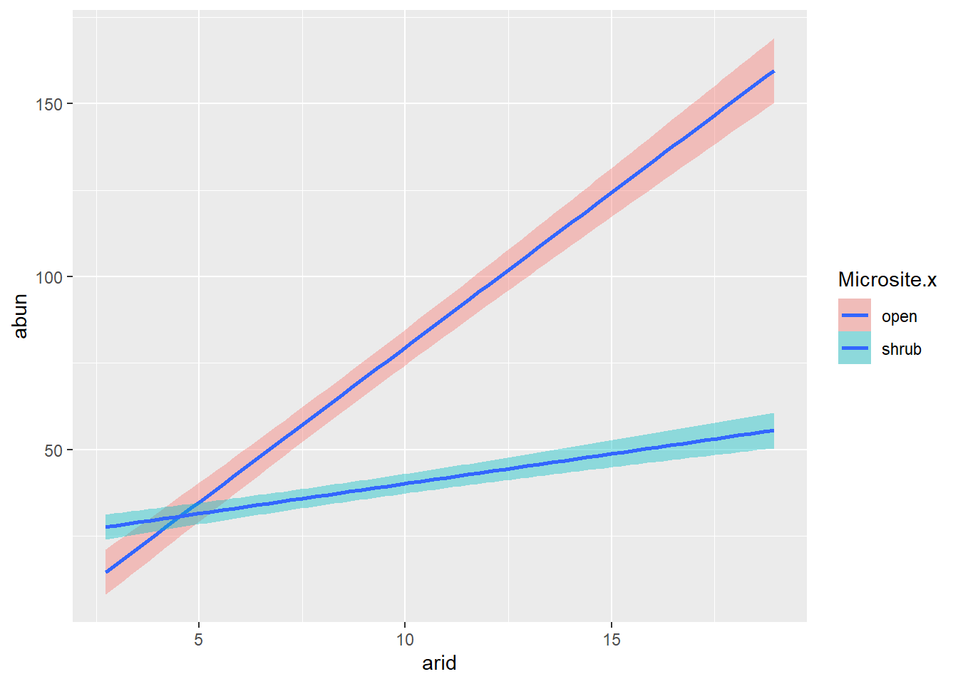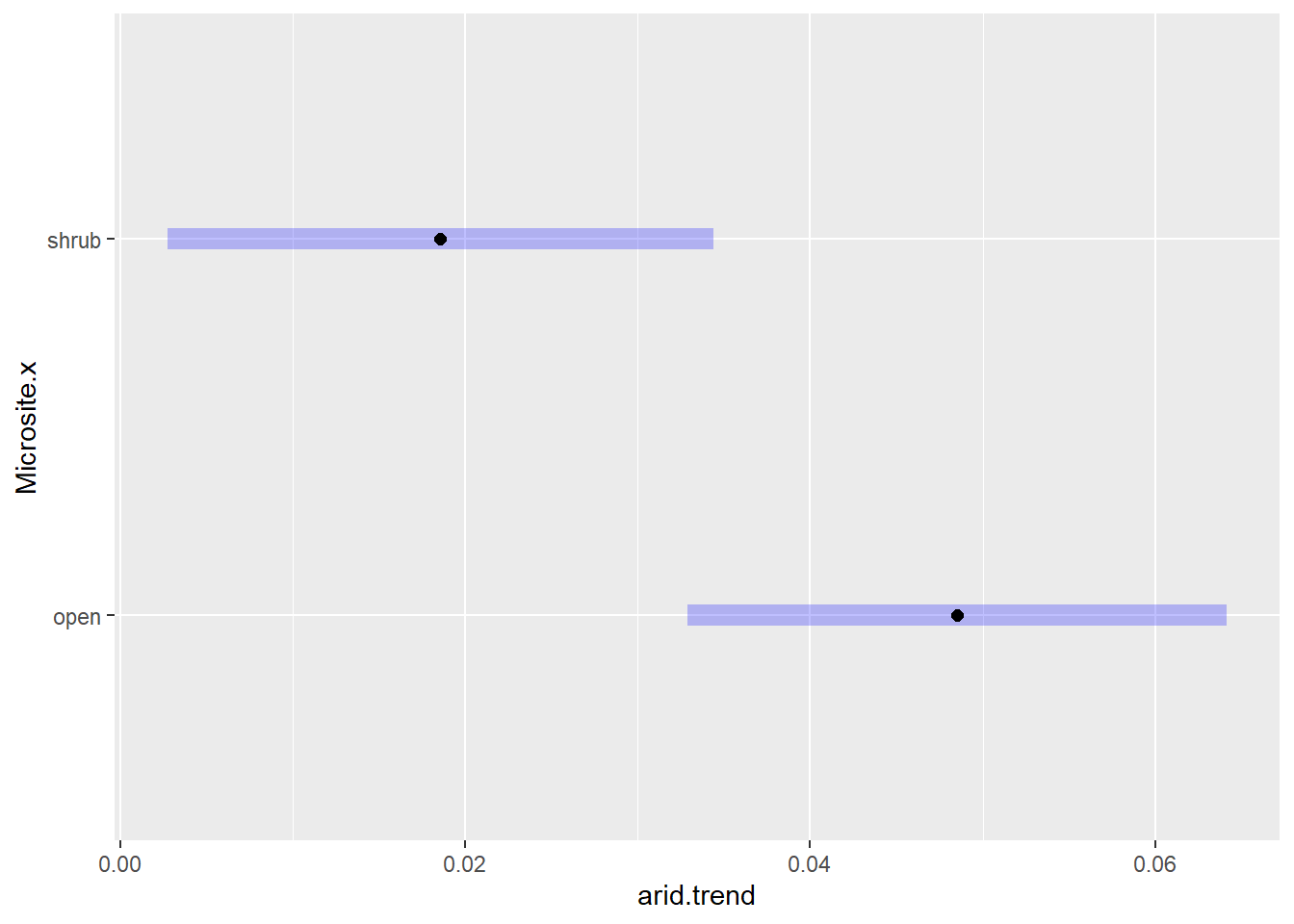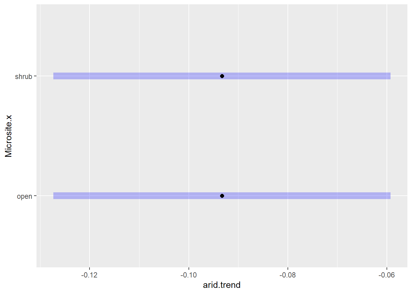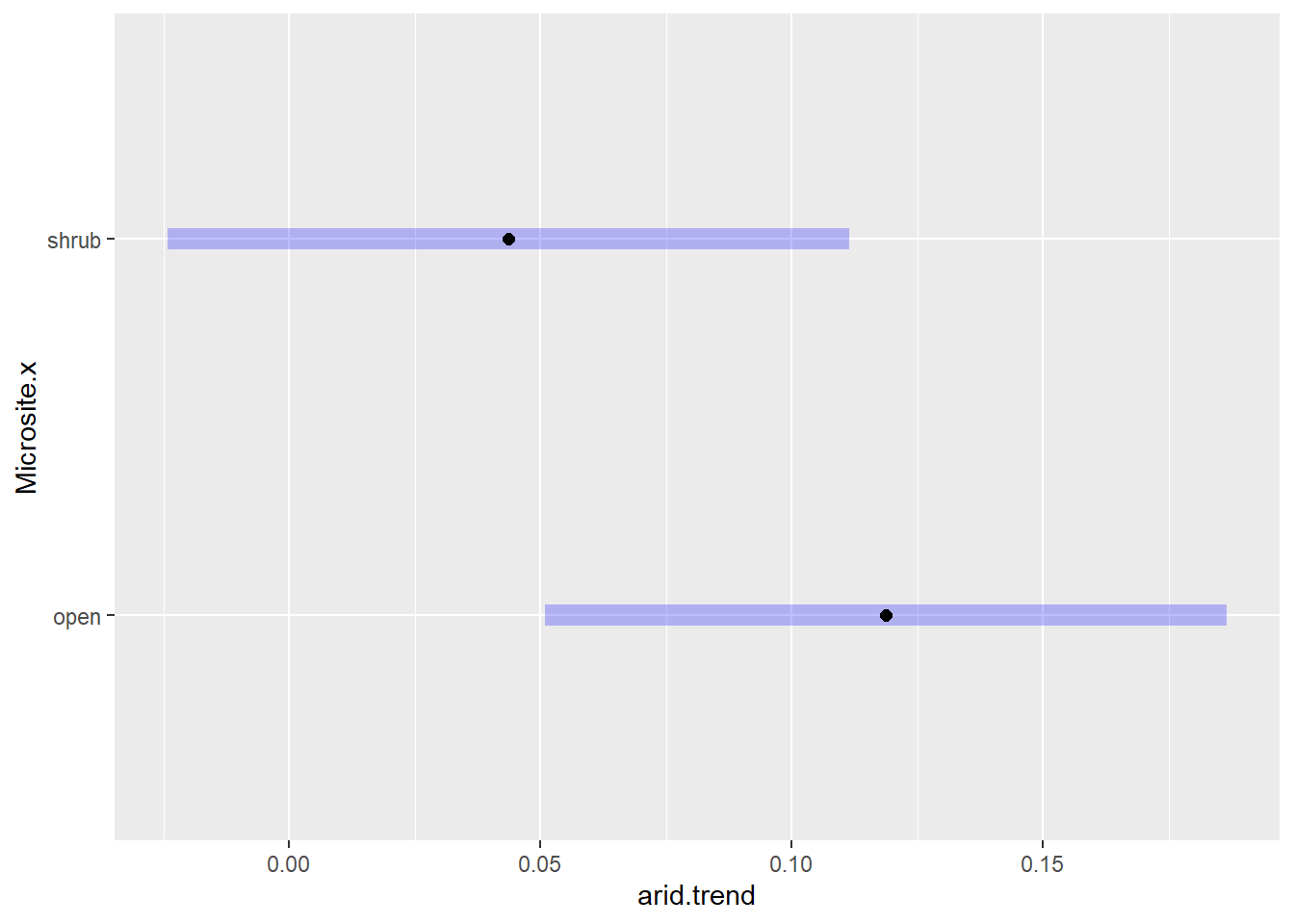 #adding a random effect for year doesn't improvem1 <-glmmTMB(rich ~ arid + Microsite.x + (1|Site) + (1|Year), family =poisson(), plt.ag)#adding ndvi does not improvem2 <-glmmTMB(rich ~ arid * Microsite.x + ndvi + (1|Site), family =poisson(), plt.ag)