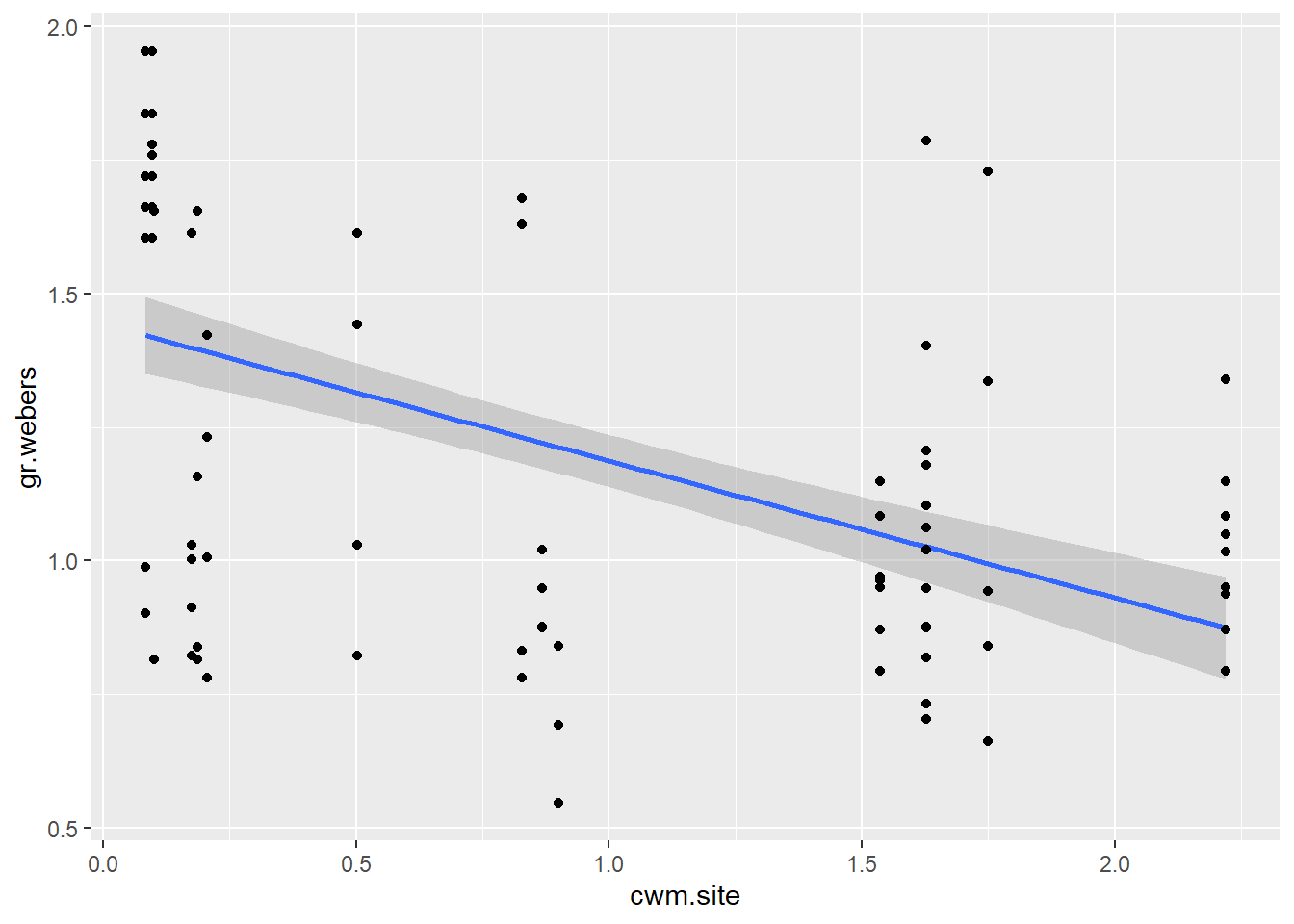 cwm.nat <- func.nat$CWMcwm.nat$uniID <- uniIDcwm.nat <-rename(cwm.nat, nat.cwm = seed.weight)#cwm to main datasetplt.ag <-left_join(plt.ag, cwm, by ="uniID")plt.ag <-left_join(plt.ag, cwm.inv, by ="uniID")plt.ag <-left_join(plt.ag, cwm.nat, by ="uniID")#site level by speciescomm.site <- plt_wide %>%group_by(Site, Year.NA) %>%summarise(across(where(is.numeric), sum))
