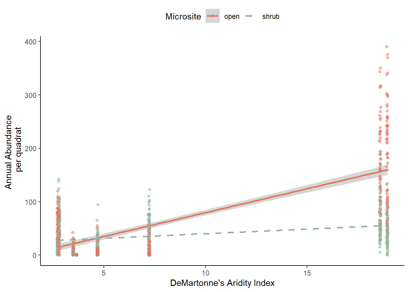 precip <-read.csv("Raw Data/winterprecip_compiled.csv")precip$Year <-as.factor(precip$Year)plt.ag <-left_join(plt.ag, precip, by =c("Site", "Year"))plt.ag <-filter(plt.ag, Season =="spring")#remove doubled rowsplt.ag <-unique(plt.ag)#attach provence for invasive/native infoprov <-read.csv("Raw Data/plantprov.csv")plts <-left_join(plts, prov, by ="species")prov.ag <- plts %>%group_by(Year.NA, Rep.NA, Site, Microsite, prov) %>%summarise(prov.abun =sum(abun)) %>%ungroup()