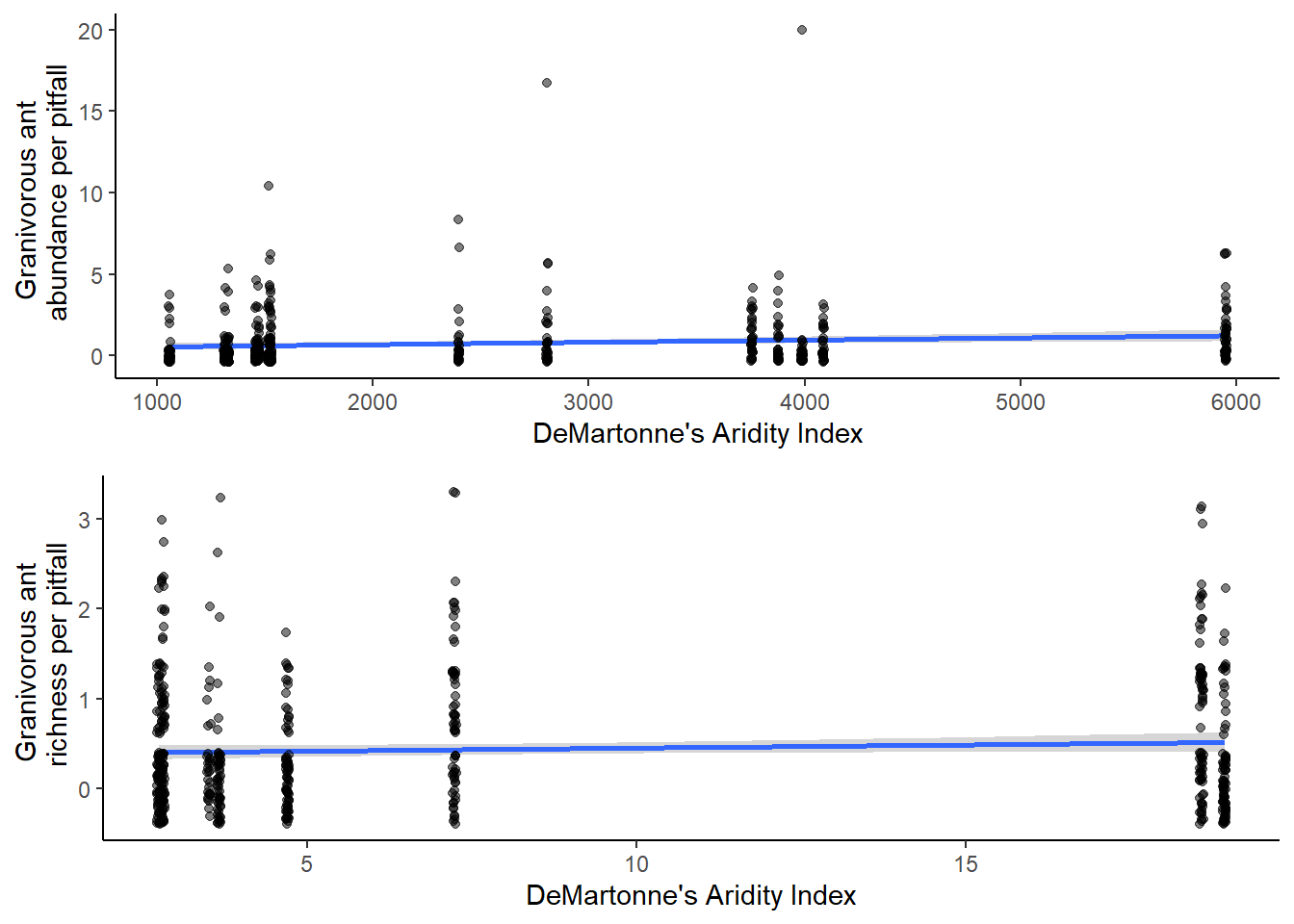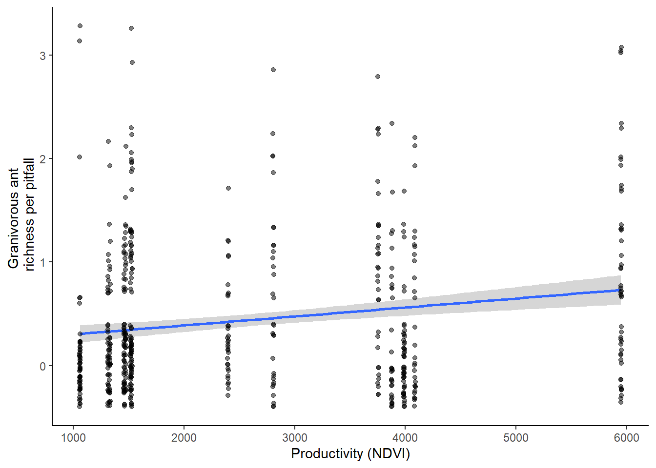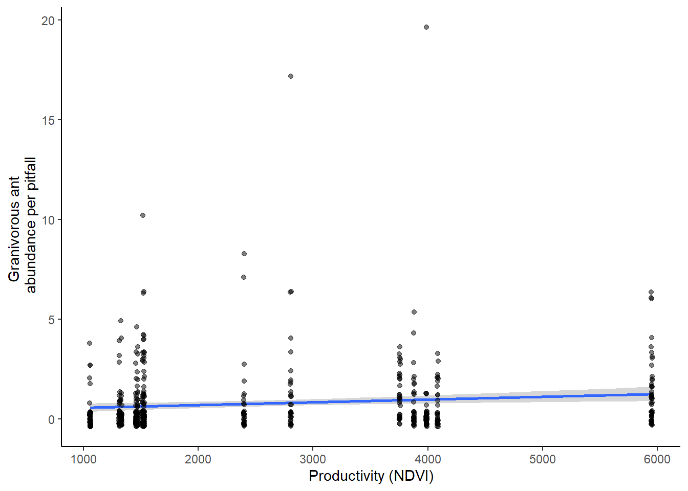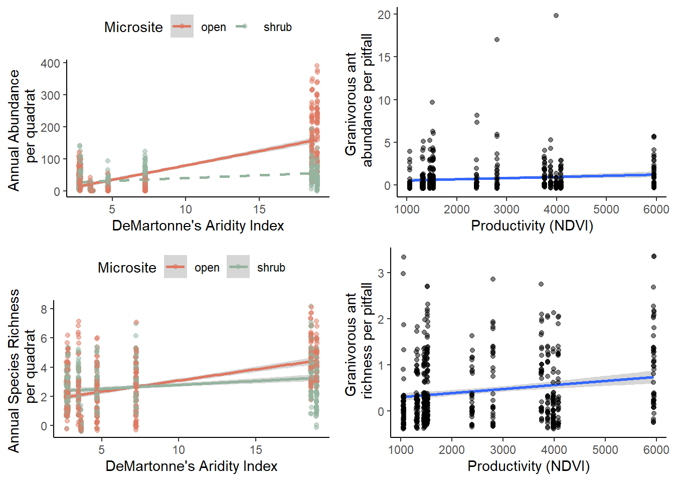 sites <-read.csv("Raw Data/sites.csv")sites <-st_as_sf(sites, coords=c("Long","Lat"), crs=4326)# plot(sites)# st_write(sites, "studysites.shp")# # #read in bioclim data from other repoenv <- terra::rast("F:/CH2_ant-plant_mutualism_synthesis/na_rasters.grd")#MAP and MAT from Worldclim climsites <- terra::extract(env, sites)sites <-cbind(climsites, sites)sites <-select(sites, 2, 5, 21:25)#clean up NDVI valuessites <-rename(sites, MAT = wc2.1_30s_bio_1, MAP = wc2.1_30s_bio_12)sites <-select(sites, 1:3, 5, 7)sites <-unique(sites)ndvi <-read.csv("Raw Data/NDVI.csv")ndvi$NDVI20231[is.na(ndvi$NDVI20231)] <-0ndvi$NDVI20241[is.na(ndvi$NDVI20241)] <-0ndvi <-mutate(ndvi, ndvi = NDVI20231 + NDVI20241)ndvi <-select(ndvi, 1:3, 8)ndvi <-left_join(ndvi, sites, by =c("Site", "Year"))